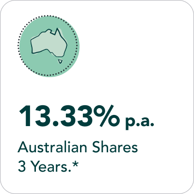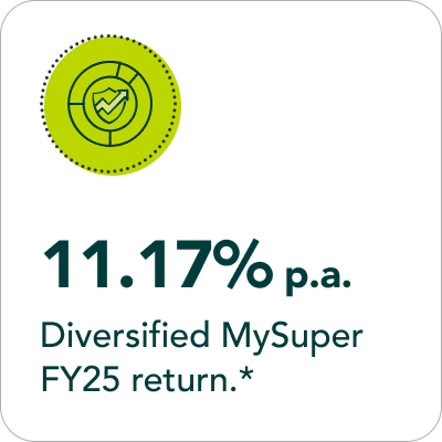 *11.17%p.a Diversified mySuper FY25 return. 13.33%p.a Australian Shares 3 years. 10.83%p.a. Indexed Growth 3 years. Investment performance is net of tax and investment expense, for the year ending 30 June 2025. View our investment performance table for other time periods. Past performance is not a reliable indicator of future performance.
